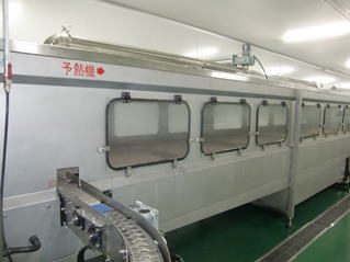 充填された製品をコンベアで熱水内を移動させて殺菌します。